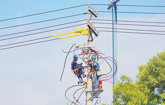 8月19日,国网济源供电公司带电作业人员正在对10千伏沁园南线号杆的柱上开关进行更换。