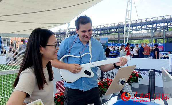 在服贸会体育服务展区,观众体验“陶朱新造局”带来新材料制作的吉他。人民网记者 吴凯摄